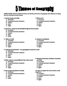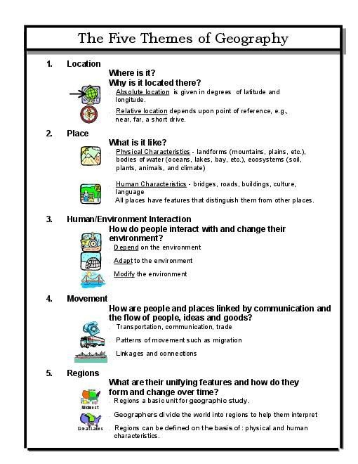 The 5 themes of geography are location, place, human-environment interaction, movement, and region. Each of these themes helps students analyze and understand different aspects of geography and how they interact with each other. Worksheets that focus on these themes can be a valuable tool for educators to use in the classroom.