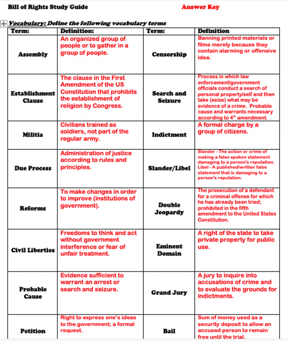 bill of rights worksheet answer key