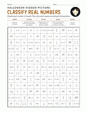 Halloween Hidden Picture Classify Real Numbers Worksheet