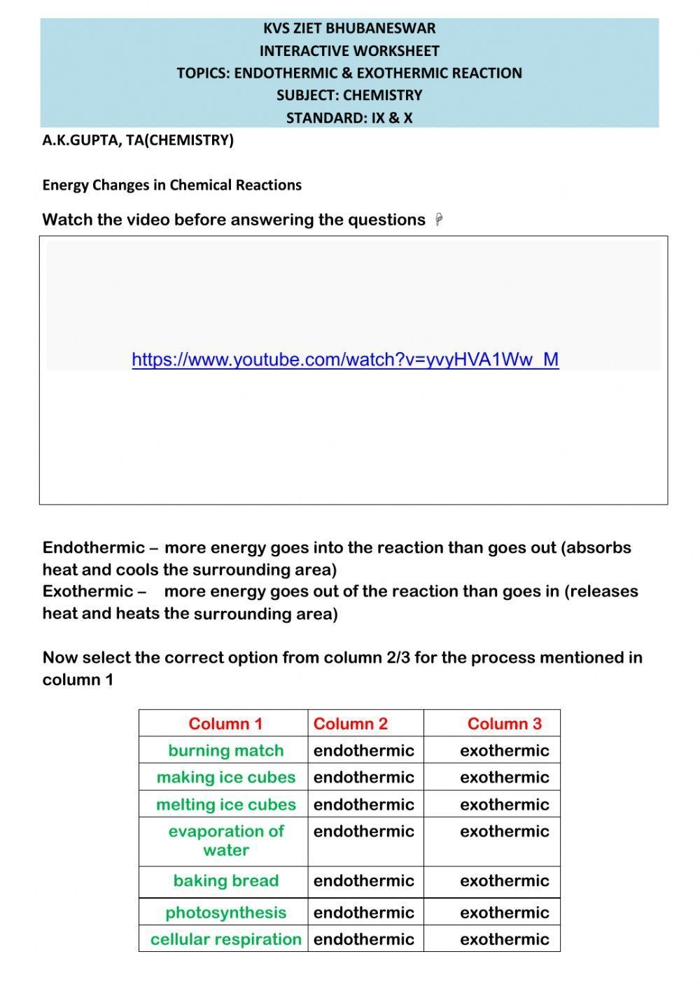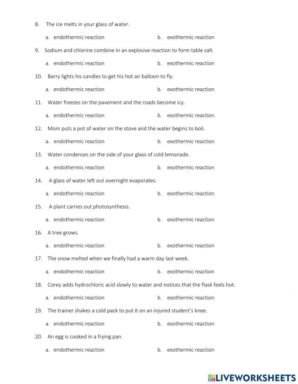 Exothermic Endothermic Reactions Worksheet Live Worksheets