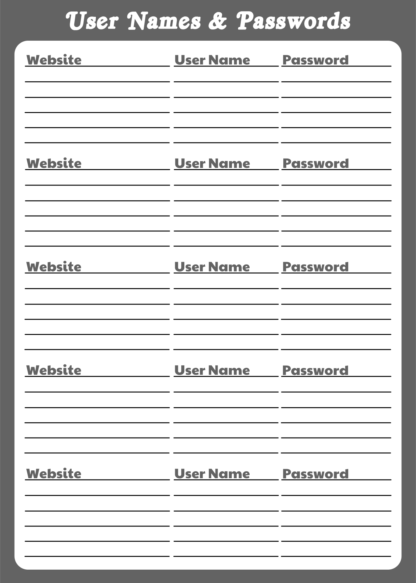 Free printable password sheets are readily available online for download. These sheets typically include sections to write down the website or account name, username, password, and any additional notes. By filling out these sheets, you can have all your passwords in one place, making it easier to access them when needed. Plus, having a physical copy of your passwords can serve as a backup in case you forget them.