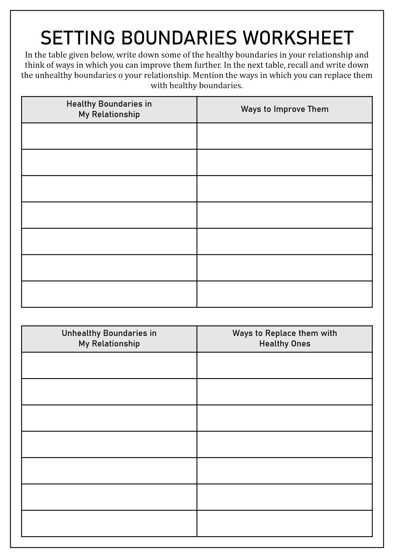 Another benefit of using printable setting boundaries worksheets is that they can serve as a reference tool for adults to refer back to when they are feeling unsure about their boundaries. By having their boundaries written down on paper, adults can easily review them and remind themselves of what is important to them. This can help to reinforce their boundaries and prevent them from being compromised in challenging situations.
