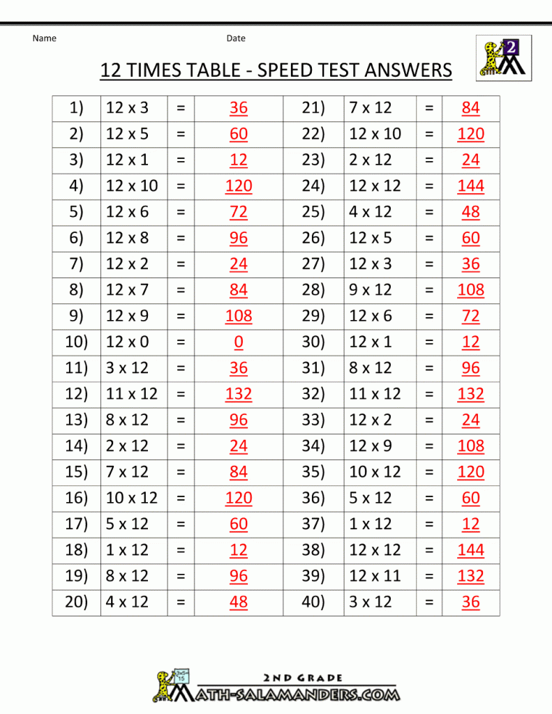 Printable Multiplication Worksheets 12 Times Table Speed Test Ans