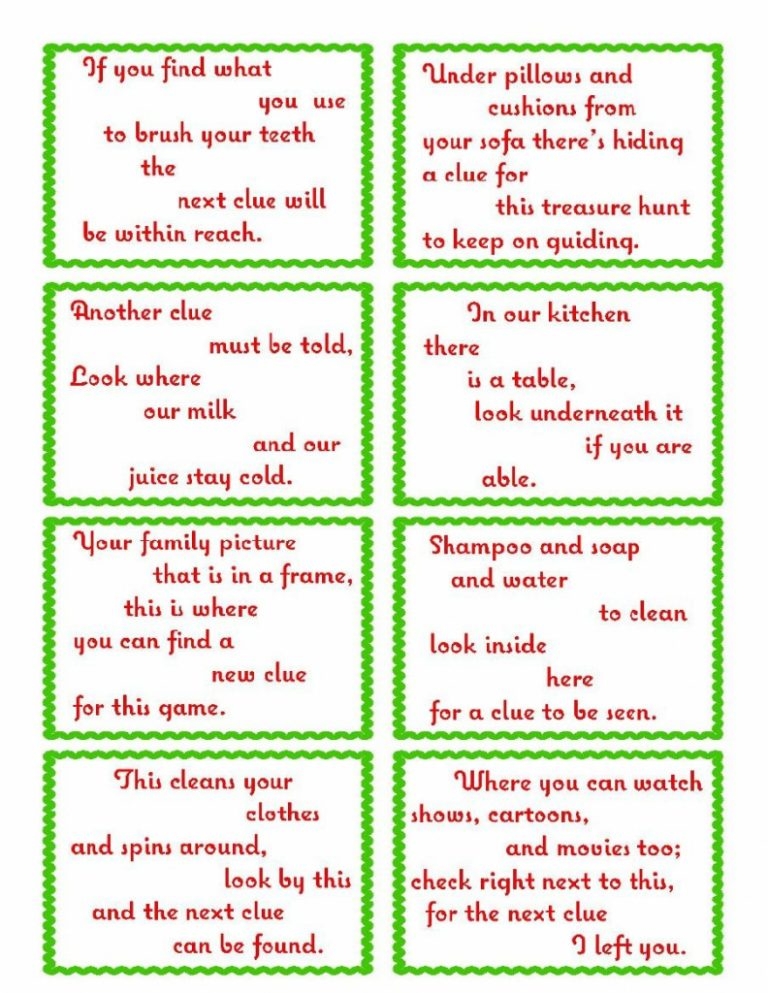In conclusion, treasure hunt clue cards printable offer a fun and engaging way to add excitement to any gathering. Whether you’re hosting a party, organizing a team-building activity, or just looking for a creative way to entertain your friends and family, printable clue cards are a versatile and convenient option. So why wait? Download your treasure hunt clue cards today and embark on a thrilling adventure that will leave everyone eager for more!