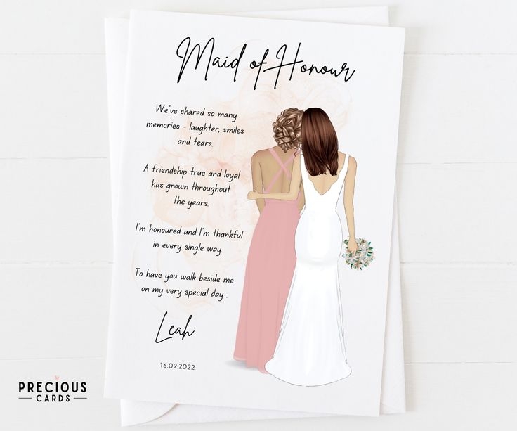 There are countless designs and styles of printable cards available online, ranging from elegant and sophisticated to fun and quirky. You can choose a card that reflects your unique relationship with your maid of honor and matches the overall theme of your wedding.