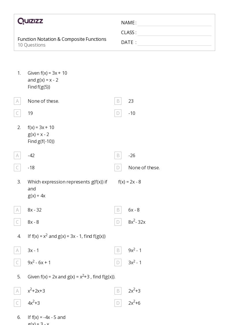 By practicing with worksheets on composite functions, students can develop their skills in manipulating functions and solving problems involving composite functions. These worksheets typically include a variety of problems that require students to compose functions, find the domain and range of composite functions, and determine the inverse of composite functions.