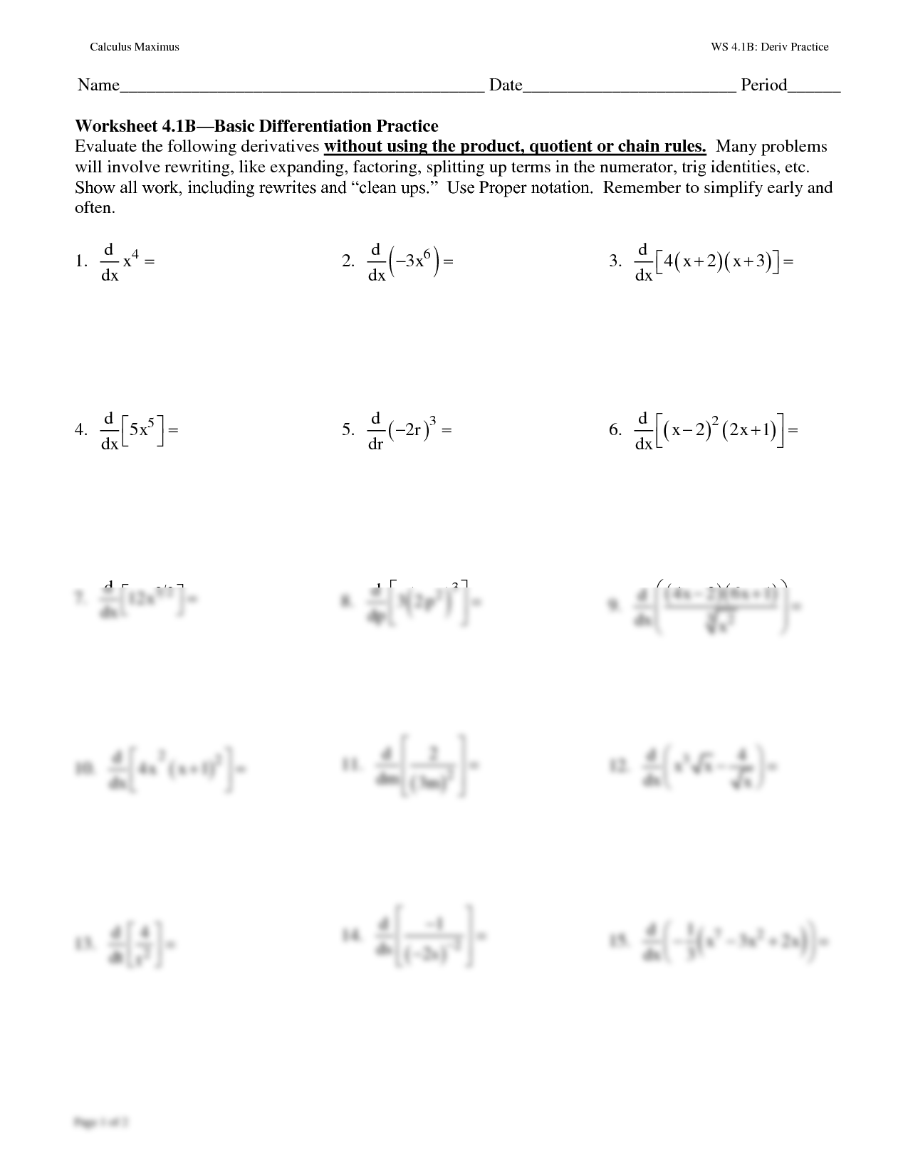 Worksheet On Derivatives