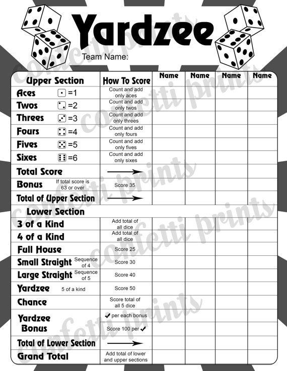 A Yardzee printable score card typically includes sections for each player’s name, as well as spaces to record scores for each round of the game. The score card may also include bonus sections for additional points, such as a “bonus Yahtzee” or “top score” section.